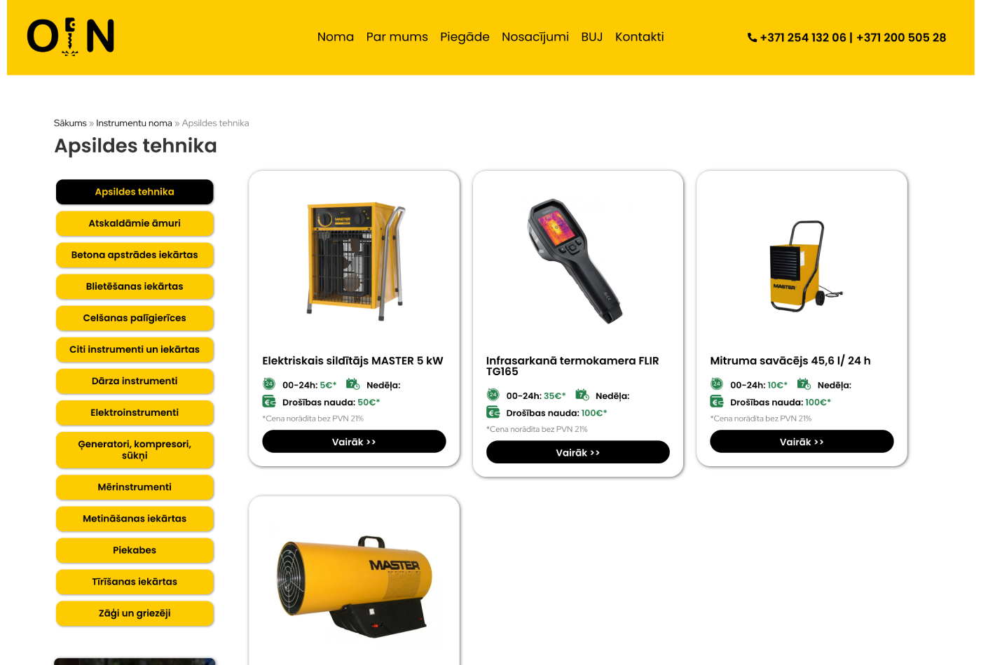 Detalizētas produktu kartītes: Katram instrumentam ir izstrādāta apraksta lapa ar tehnisko specifikāciju, skaidru cenu norādi dažādiem termiņiem (diennakts, nedēļa) un nepieciešamās drošības naudas apmēru.